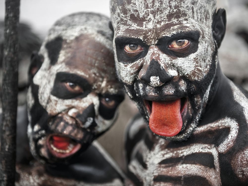 Portrait of Chimbu Skeleton tribesmen (Papua New Guinea). The Chimbu Skeleton people, an ethnic and linguistic group numbering about 180,000, first made contact with the western world in 1934. Their origins can be traced back to an intriguing legend born after a significant number of hunters ventured into the mountains but failed to return. Determined to uncover the truth, a brave group of warriors embarked on an expedition to explore the mountains and stumbled upon a cave. Inside, they discovered an abundance of human skeletons and a colossal monster. To deceive the creature, they decided to paint their bodies with skeleton bones made of black and white clay, recreating the appearance of the fallen hunters and blending the painted bones with the actual ones. The ruse succeeded, and as the monster slumbered, the warriors stealthily made their way back to the safety of their village. Nowadays the Chimbu Skeleton paint themselves only during celebrative traditions.
