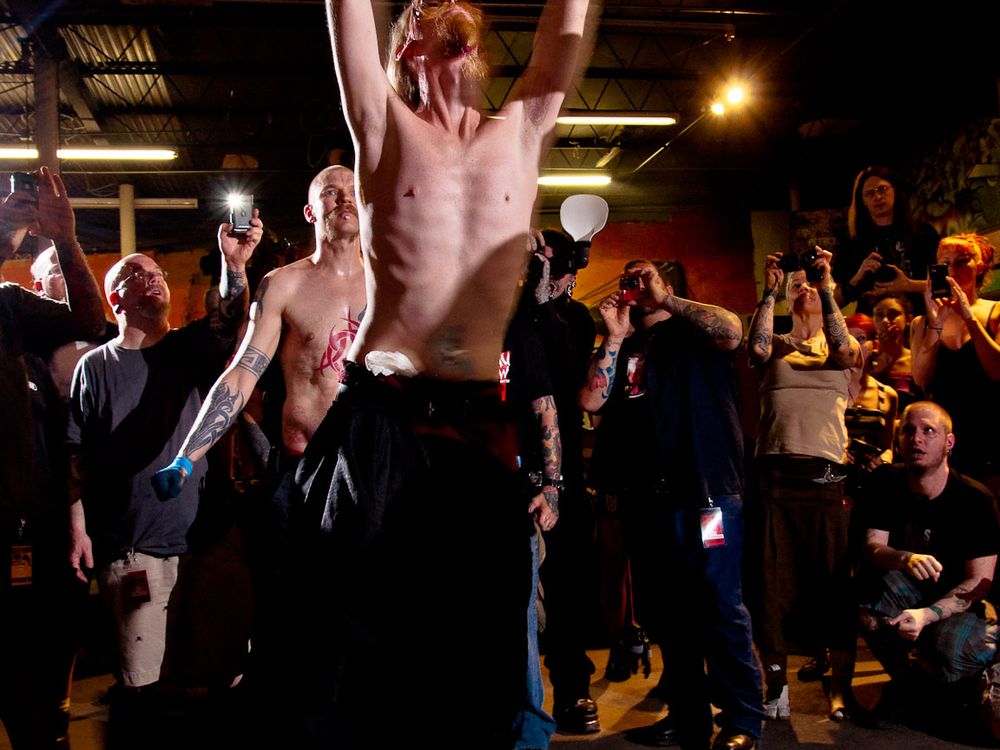 Skin and flesh stretch as Andrew Stanton swings from seven hooks piercing his face during an extremely rare "facial suspension" at the 2011 Dallas Suspension Convention.