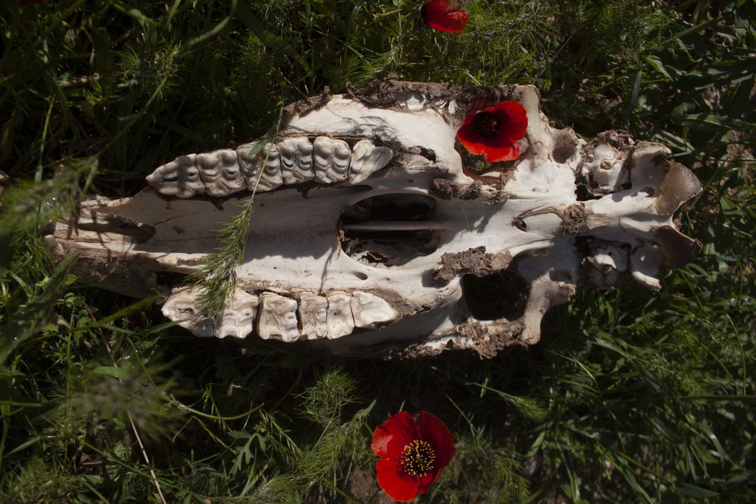 The skull of an animal, possibly domesticated, abandoned among anemones.