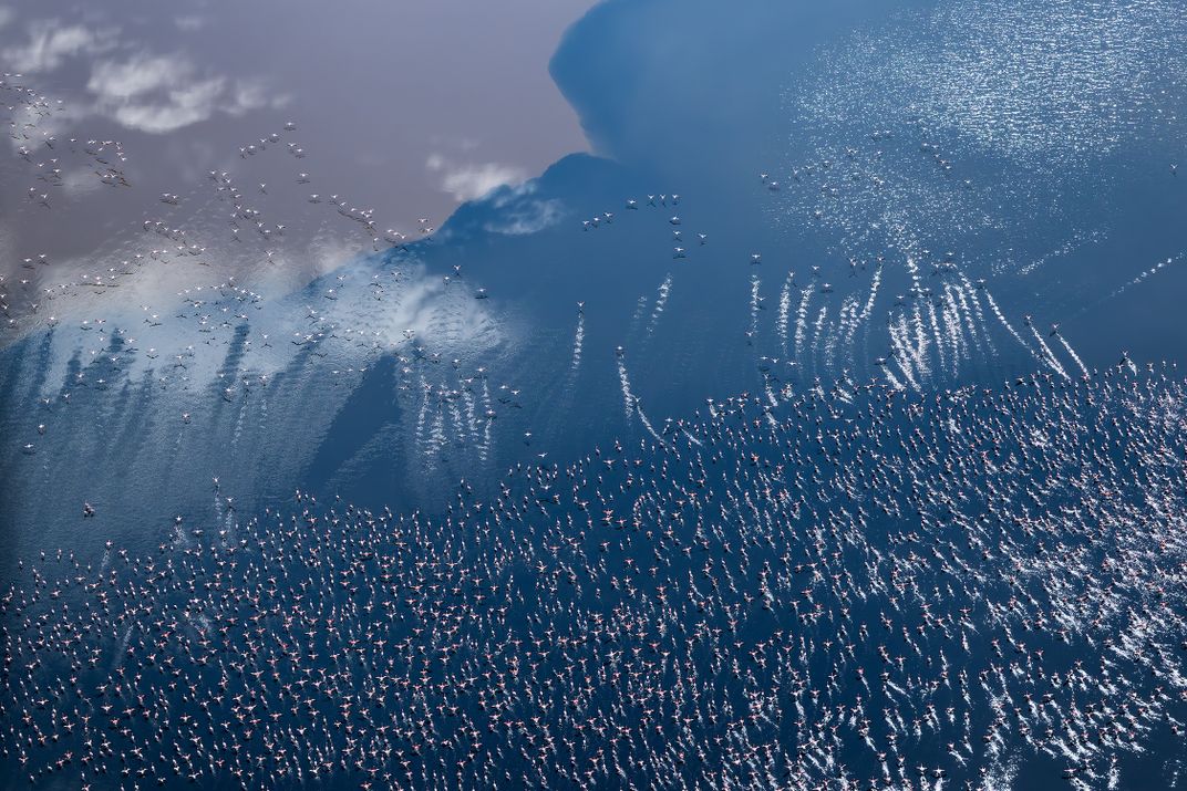 Photographed from above Lake Natron in Kenya, this high-shutter image captures a dynamic interplay between the flamingo flock, the water surface, and the sky reflected upon it. From the helicopter, the lake appeared like a vast mirror, holding the blue of the sky and drifting clouds. As the flamingos accelerated across the shallow water, their wings created sweeping white trails that sliced through the reflection, blending motion with mirrored light.