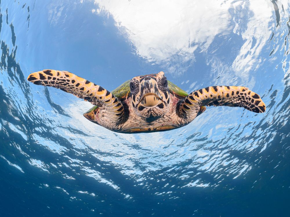 A hawksbill turtle makes a nose-dive descent after getting some air.