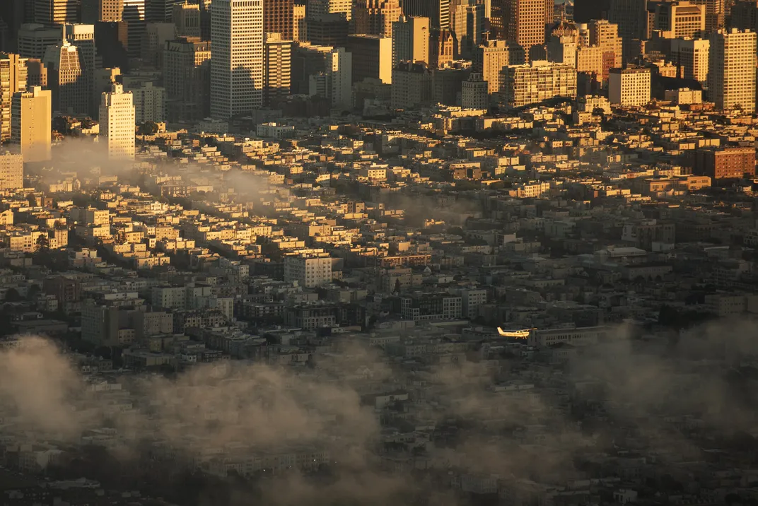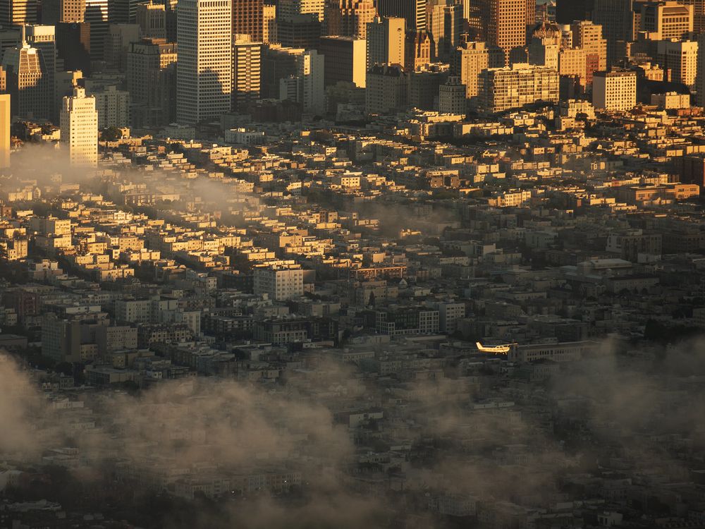 Sunset light, rising fog, and a busy San Francisco skyline unfolding beneath a Cessna’s wing—captured while I flew my Piper.