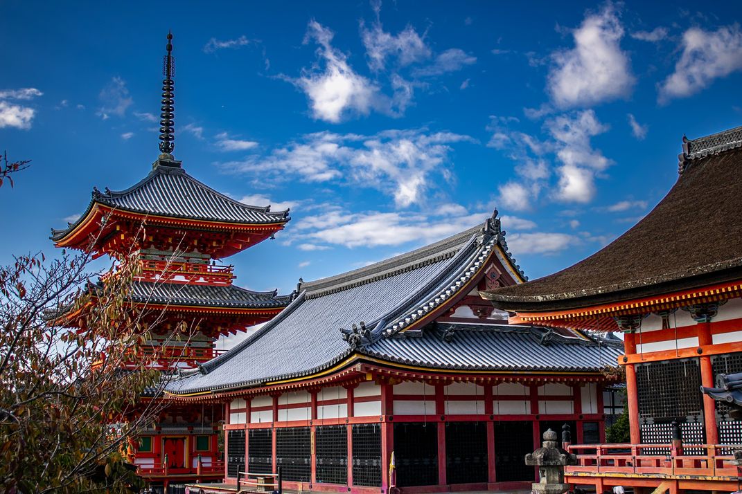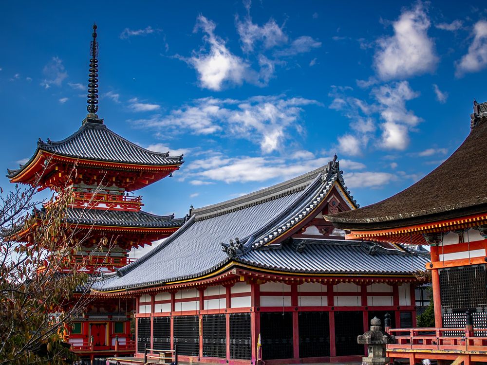 Traditional temple rooftops rise into a deep blue Kyoto sky, blending centuries-old craftsmanship with the quiet serenity of the hillside.