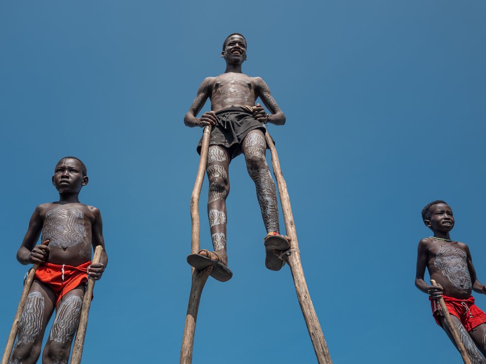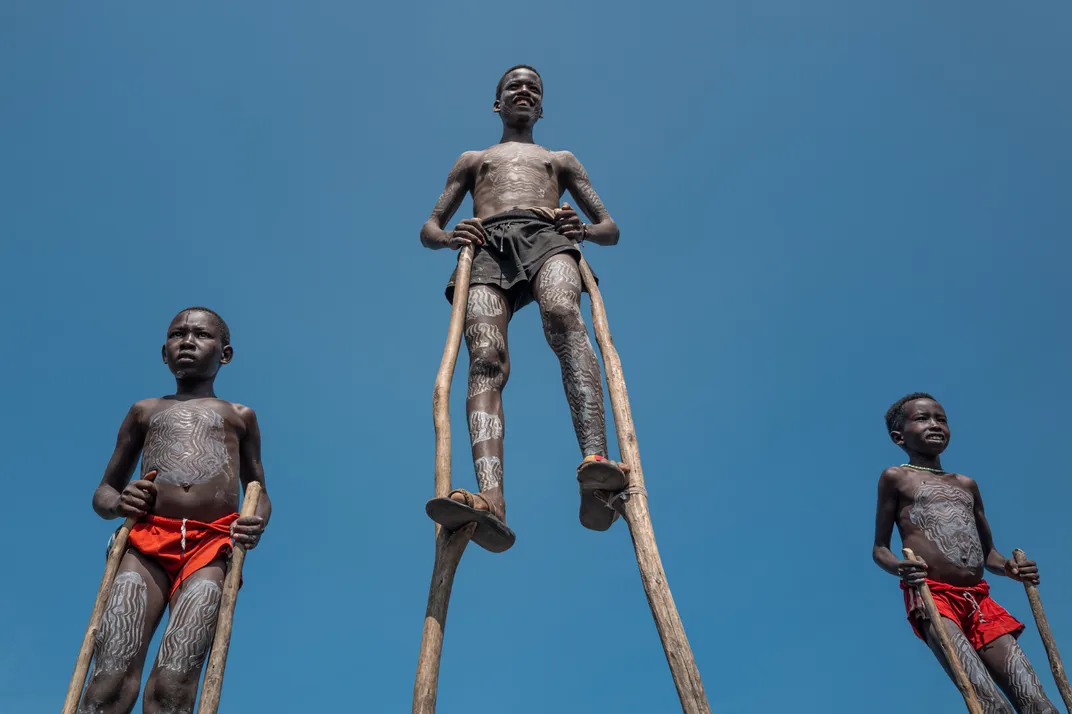 Boys from Banna village walk on stilts, their bodies painted in traditional patterns. Against the infinite blue sky, they appear suspended between earth and spirit.