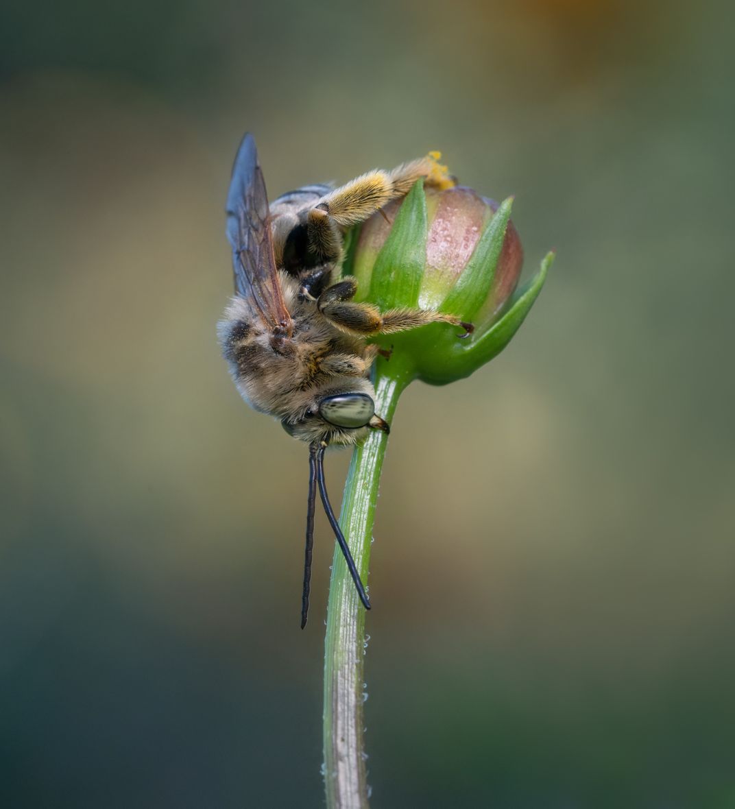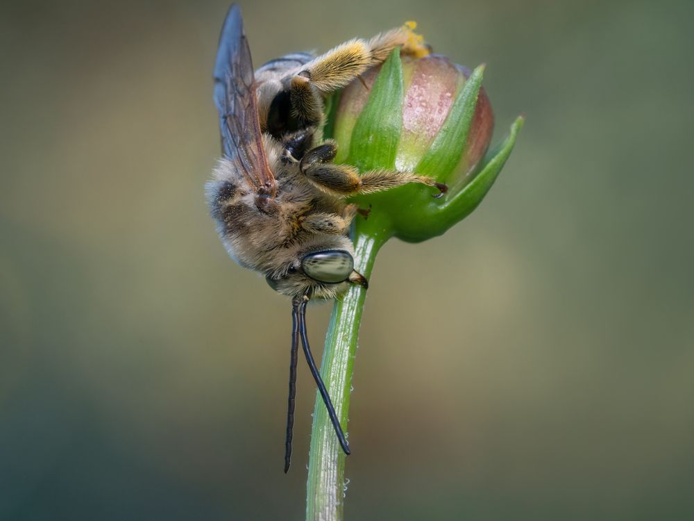 This is a Long-horned Bee sleeping on a flower bud in a garden. Male Long-horned Bees sleep on flowers, while the females stay in their terrestrial nests. What is really interesting is that these bees return to the same plants every night and, in fact, this is the second year I have seen them in the same area, with no sign of sleeping bees anywhere else near by. Also of interest, is that I have seen up to 3 separate species of long-horned bees sleeping together. They will sleep in groups, but a few will sleep alone, as the one captured in this image. Unlike European honey bees, these native bees sleep late, not stirring until about 9am.