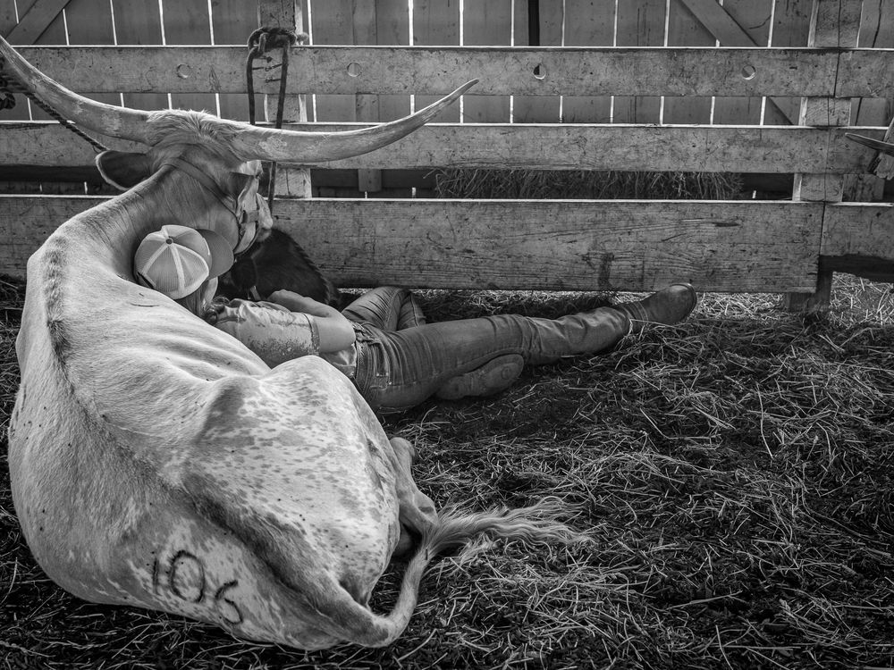 A contestant at Montgomery County Agricultural Fair, one of the many county agricultural fairs held every year across the United States during the summer and fall seasons, takes a quick nap on her longhorn cow during a break in the livestock competition.