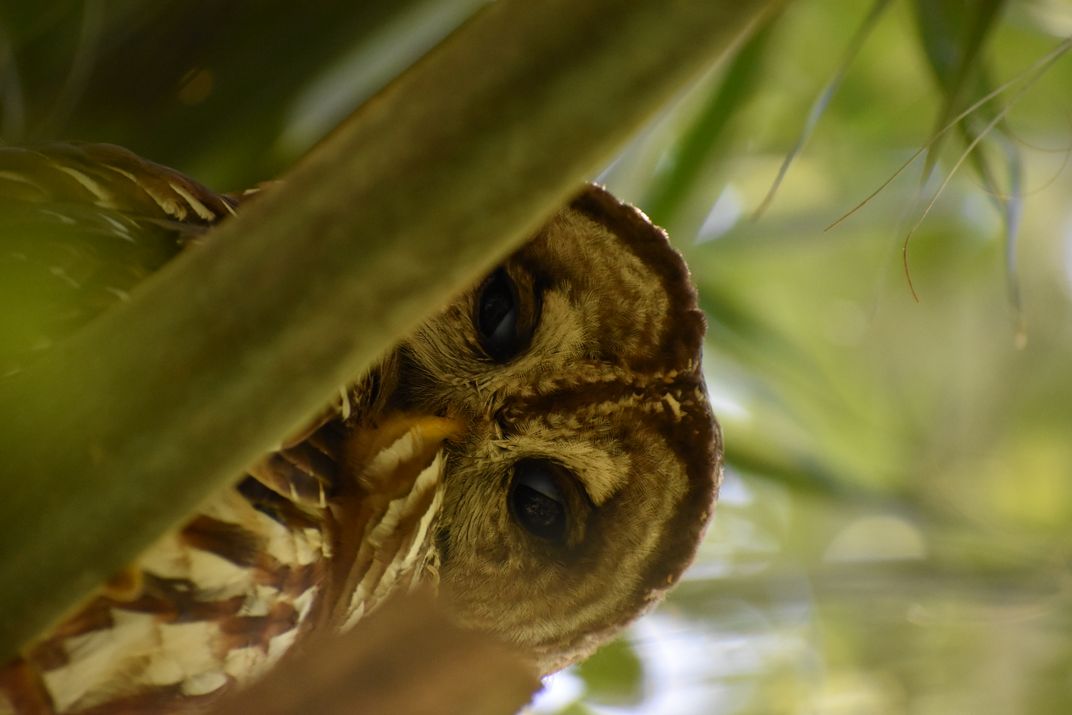 Even though most owls are nocturnal, some can be seen during the day. This barred owl was seen sitting at the top of a palm tree right next to the boardwalk. The owl was using its nictitating membrane as this shot was taken.