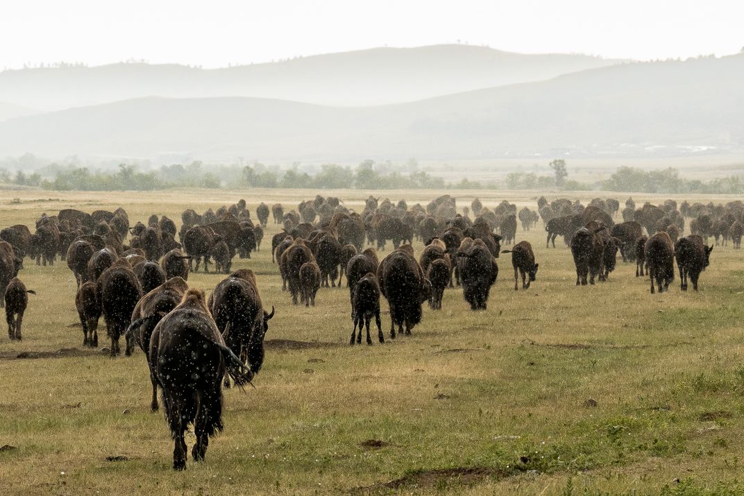 The herd of bison moved slowly from the valley out to the plains of Custer State Park, unbothered by the rain and rumble of thunder.