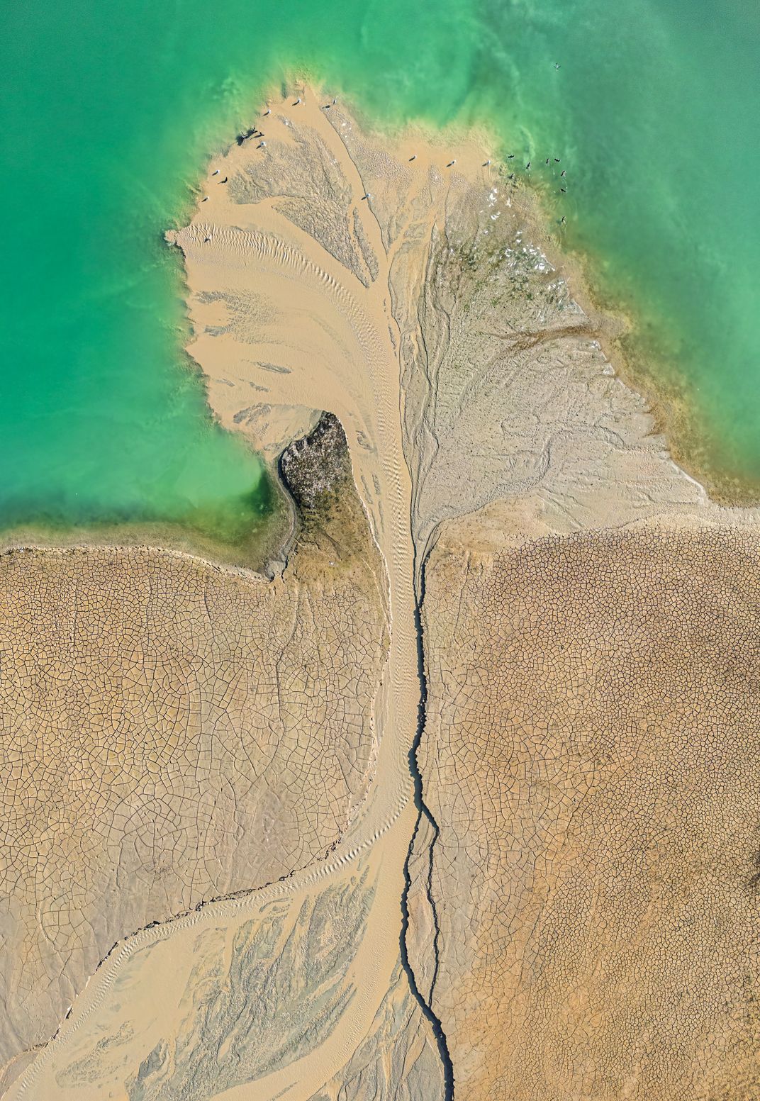 The clear mud stream running alongside the water branches out like the roots of a tree trunk. The surface forms create a tree-like shape in the landscape.