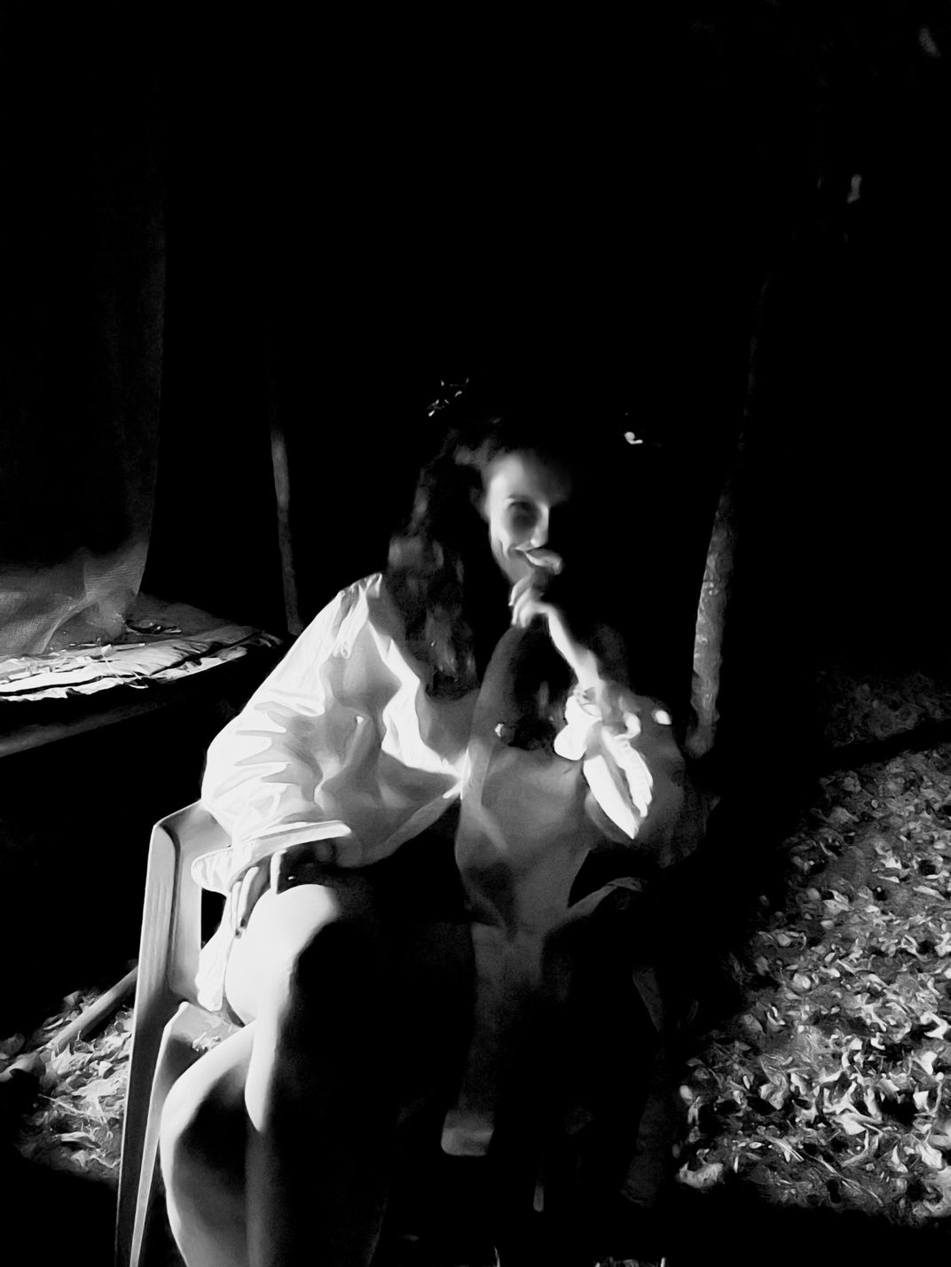 A black-and-white shot capturing a smile in a quiet moment outdoors at night, with dramatic lighting and deep shadows creating a sense of mystery and intimacy in the scene.