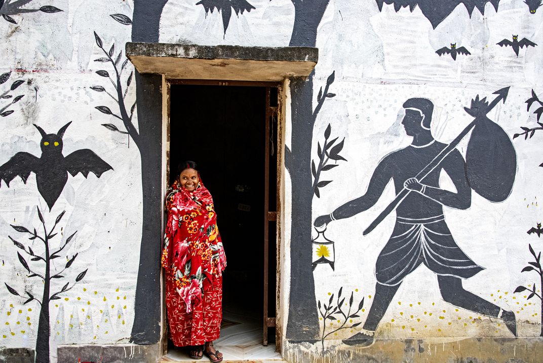 A woman wrapped in a bright red shawl smiles shyly from her doorway, framed by bold tribal wall art in rural Jhargram. Her warmth contrasts beautifully with the monochrome murals, capturing culture, charm, and everyday life in one vivid moment.