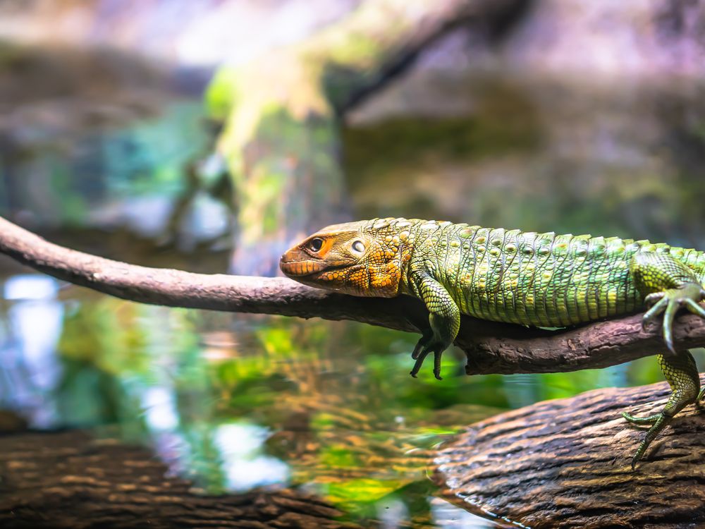 A Caiman Lizard also known as Water Tegu confined in a replicated environment at the Zoo. Enjoying its daily chill.
