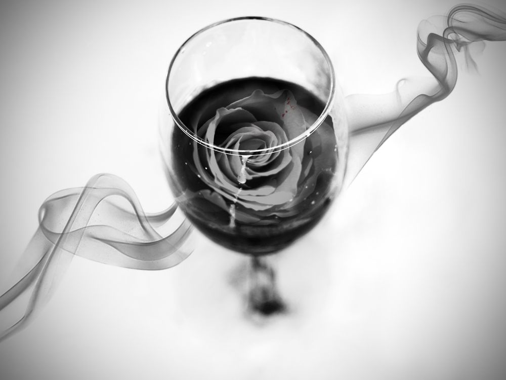 The smoke symbolizes mystery, it provokes curiosity. This is what first draws the person in. The wine glass symbolizes the delicate body of someone who has made themselves vulnerable by falling in love. This is what holds the rose. The rose represents love itself. This image tells two different love stories, depending on the way the viewer perceives one specific detail. On the front of the glass, you can see a drip of the wine running down the glass. Does this represent the broken-hearted lover's tears? Or, does it represent the overflowing abundance of love spilling over?