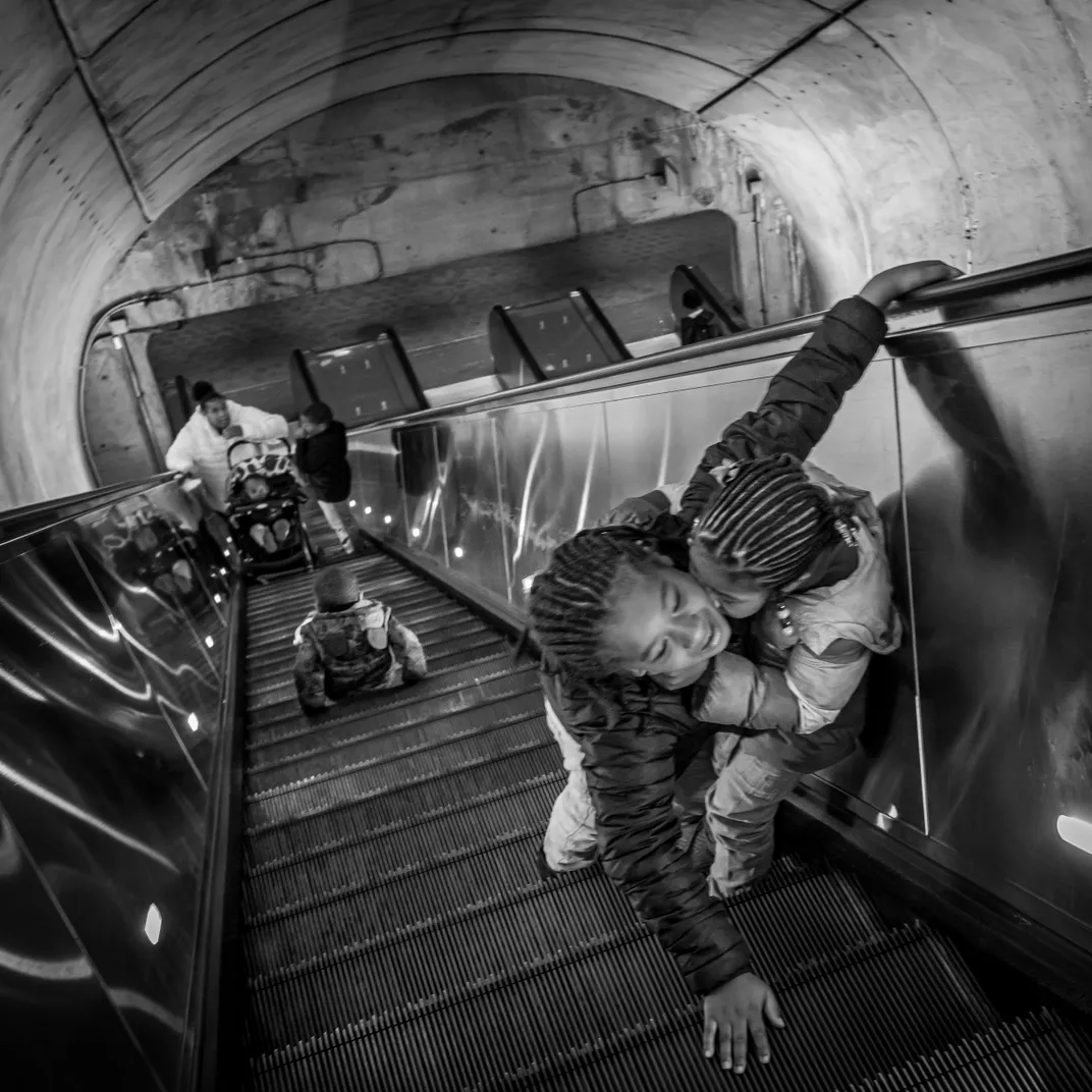 Siblings roughhousing on the escalator to the subway in Washington, DC.