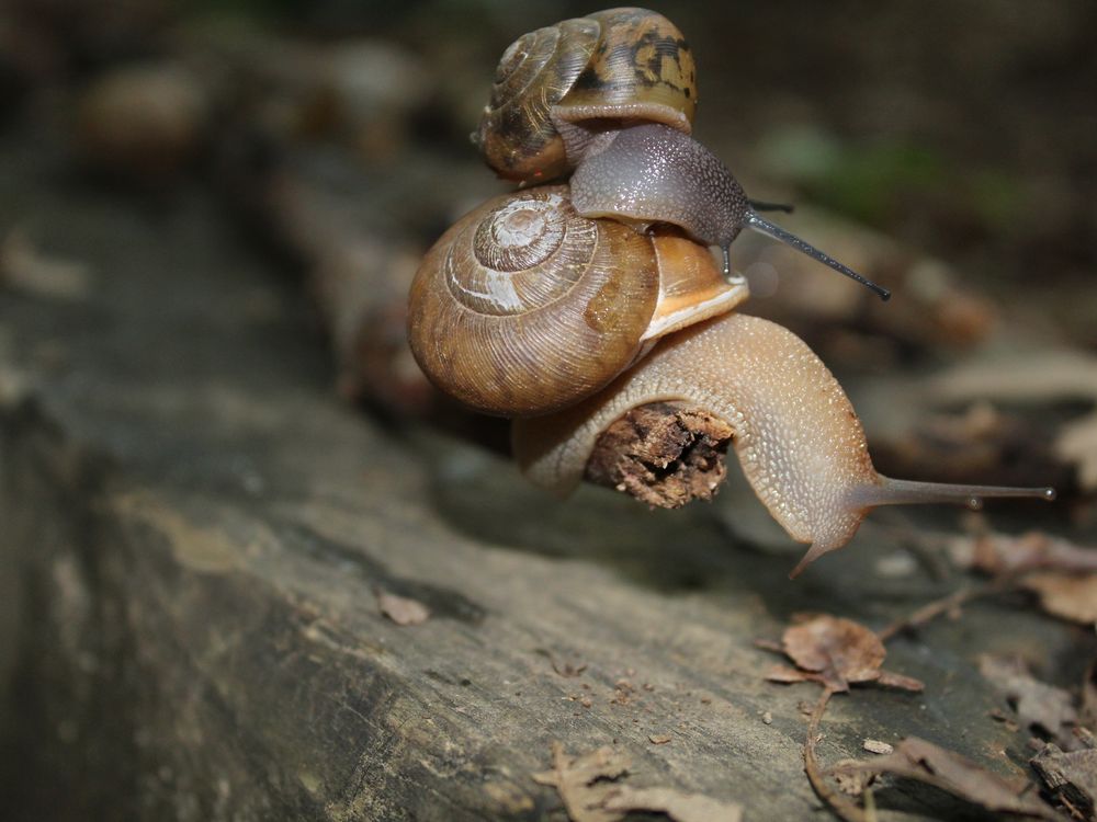 We were camping and my niece kept finding snails everywhere. Then we came across these two, and the little one had decided to take a ride on the big one.
