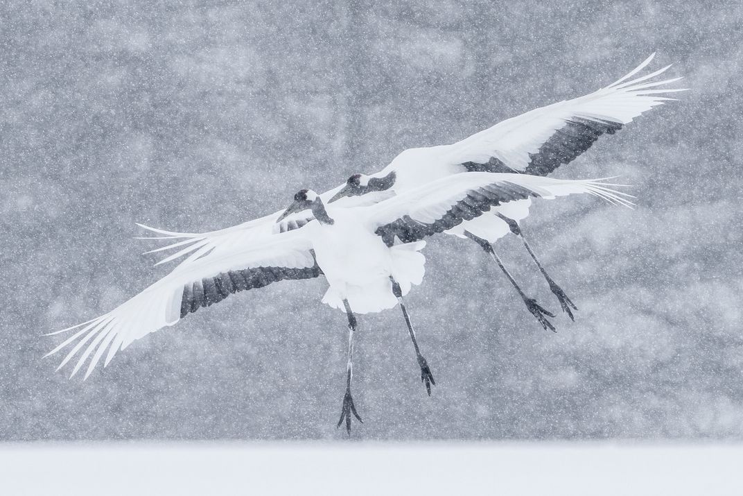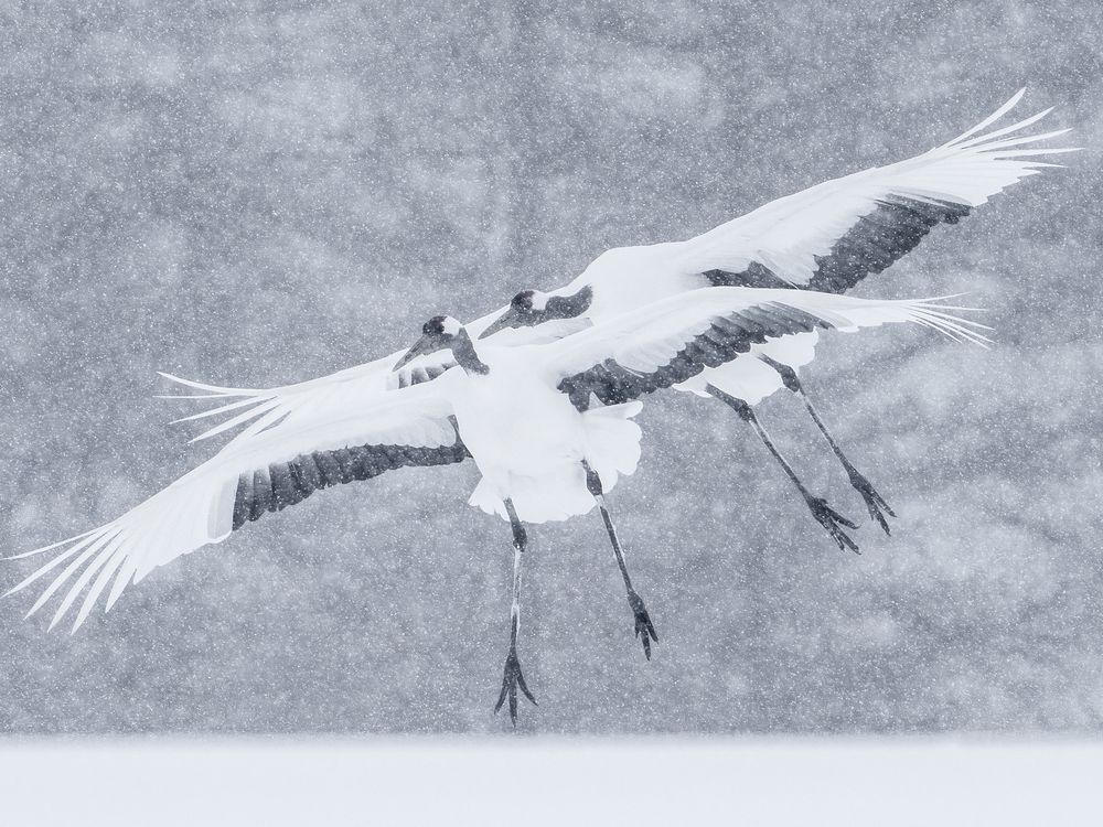 A pair of Red-crowned Cranes, also called Snow Cranes, fly in to a preserve during a snowstorm.