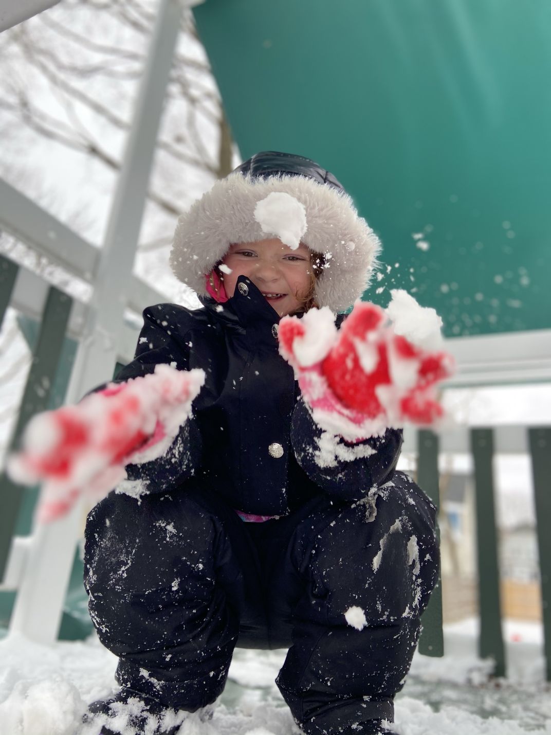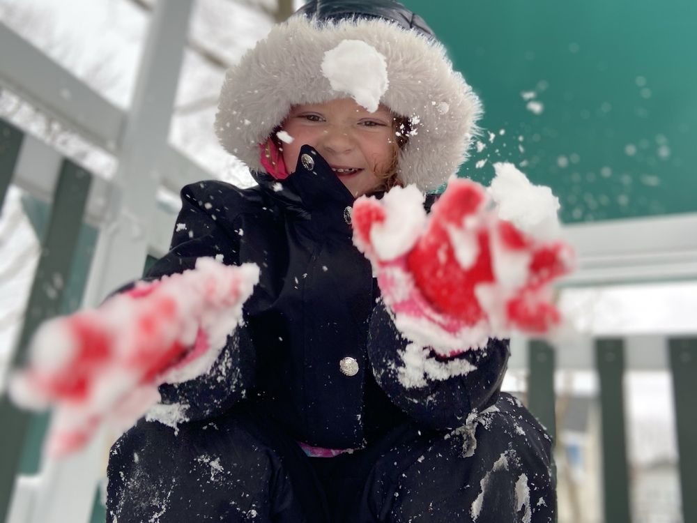 This photo is showing my little sister playing in the snow. She was giggling and throwing snow at me as I capture the shot.