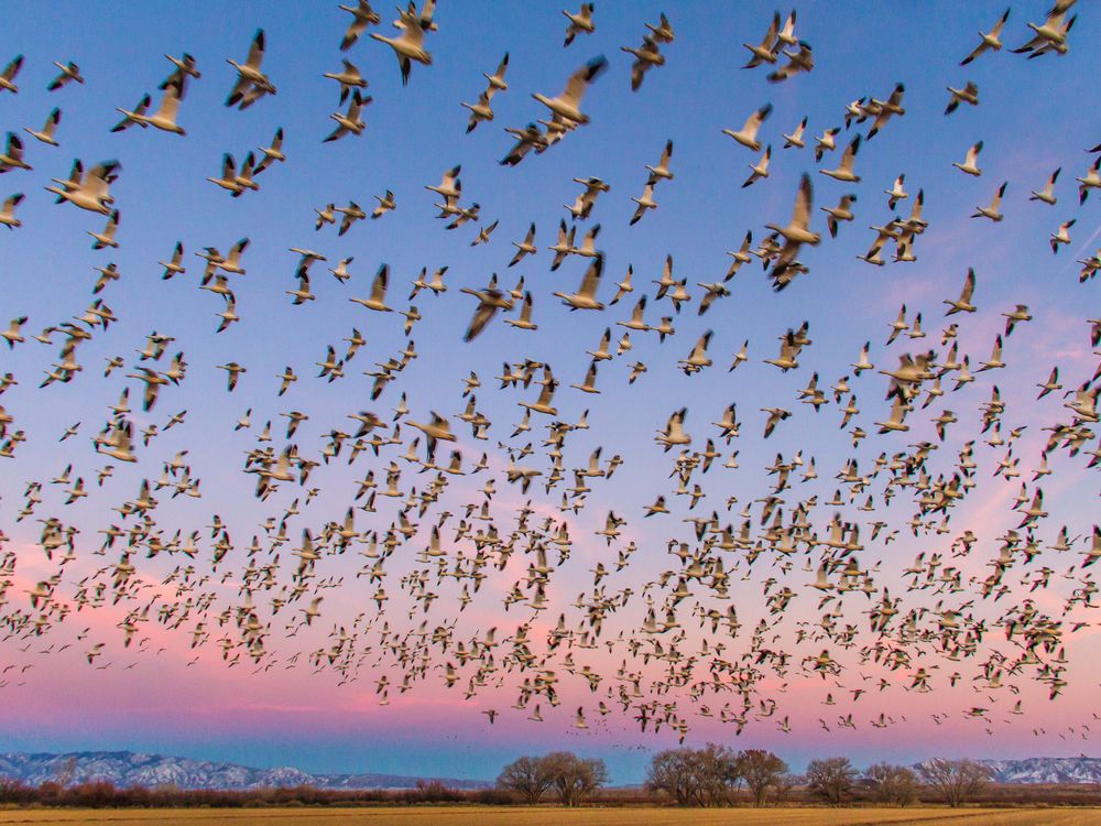 The Snow Geese spend the day in fields and then take off in a massive blastoff to go to the area where they will spend the night.