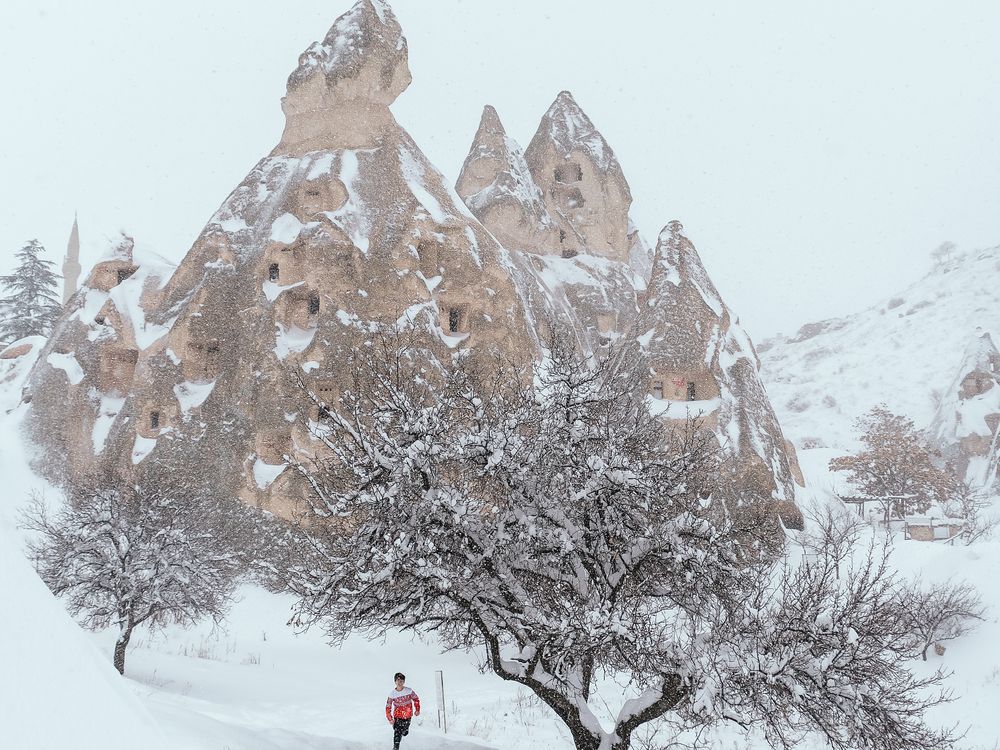 A boy is running at the snow-covered Fairy Chimneys in Cappadocia/Turkiye. The Cappadocia region experienced heavy snowfall in February 2025.