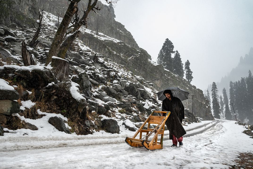 I have taken this image at Chandanwari, this is a sightseeing of Pahalgam, Kashmir. When I have reached there, that time snowfall was continuing. That was this season's first snowfall. A local people was coming with wooden sledge vehicle with local costume.