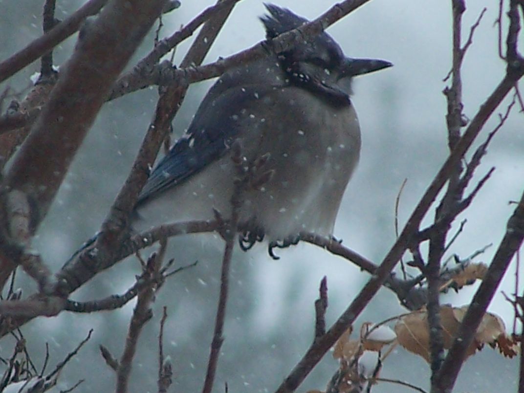 In the quiet of an early day snowfall the blue jay waits patiently for peanuts.