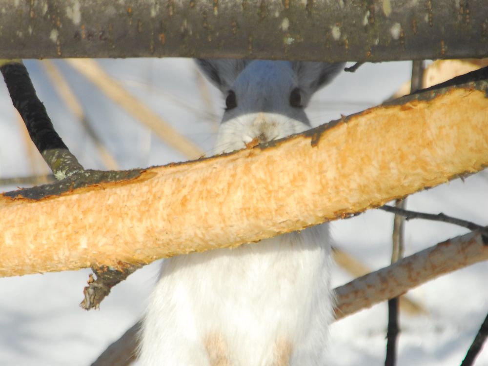 Snowshoe Hare peeking out and eating bark off a tree branch