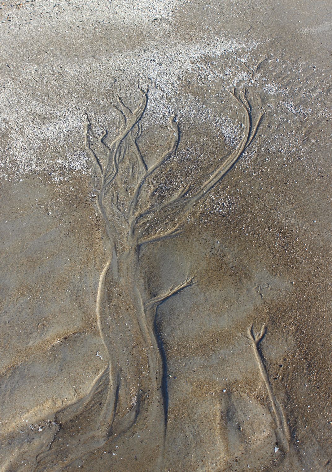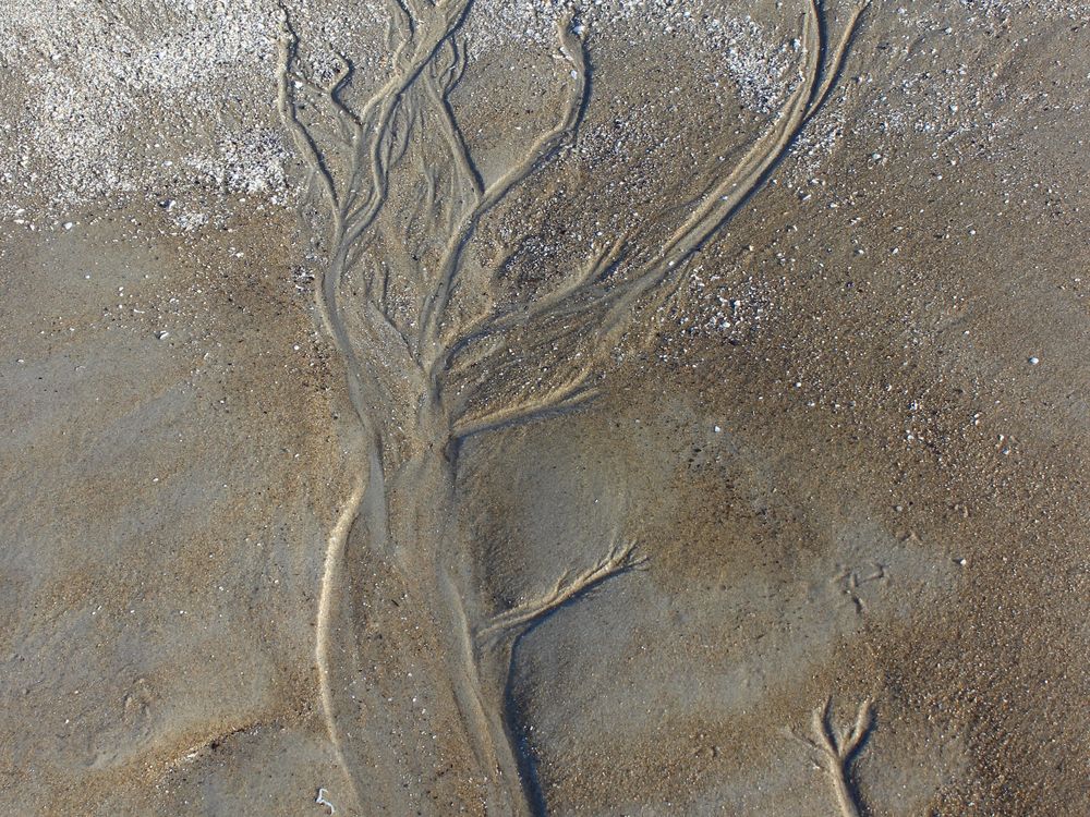 This is part of a series of photos that I enjoy taking, called Sandpaintings. The patterns are created by the ebb and flow of the ocean. The white areas are cracked shells that nature placed on top of the sand trees.