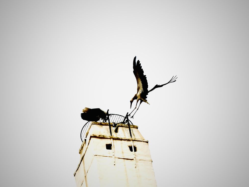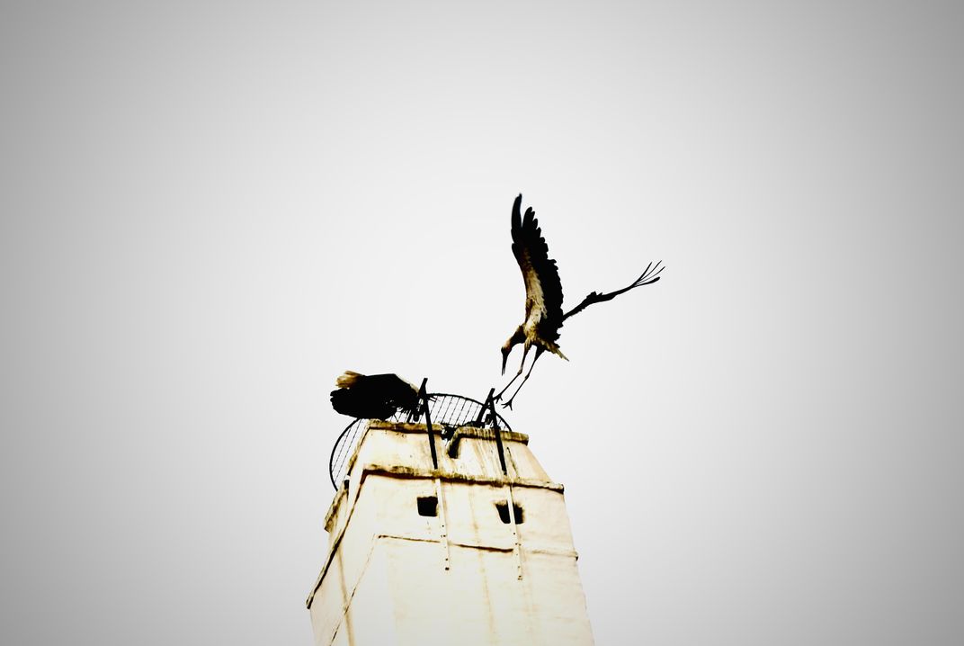 Stork landing in nest in Austrian village east of Vienna near the Slovakian border.