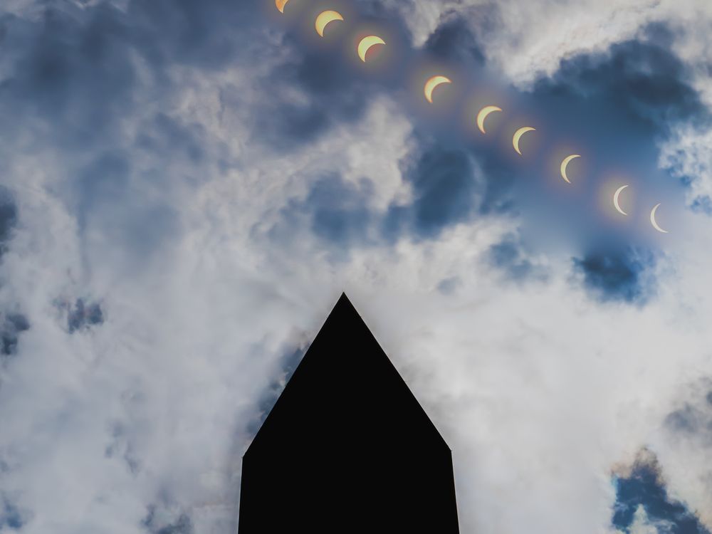 The solar eclipse was visible in Washington DC between 2:04 and 4:32 PM. The maximum eclipse was at 3:20 pm, with the Sun 87% covered by the Moon. I blended 13 images to show the motion creatively over the most symbolic structure in the US.