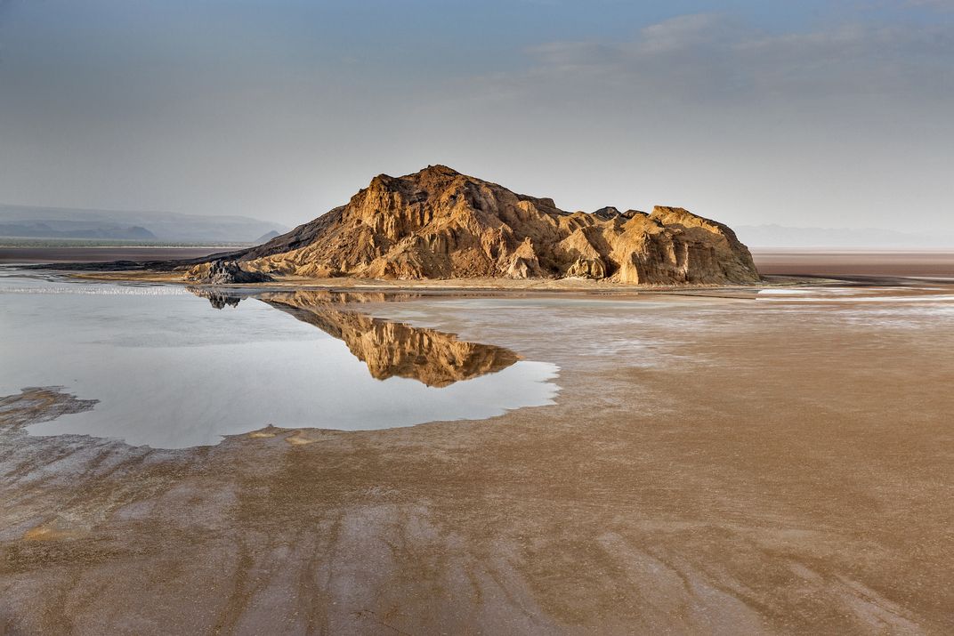 A solitary mountain breaks the horizon in Africa.