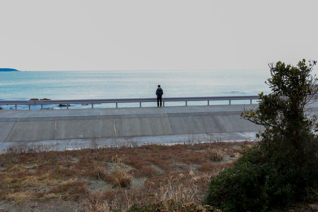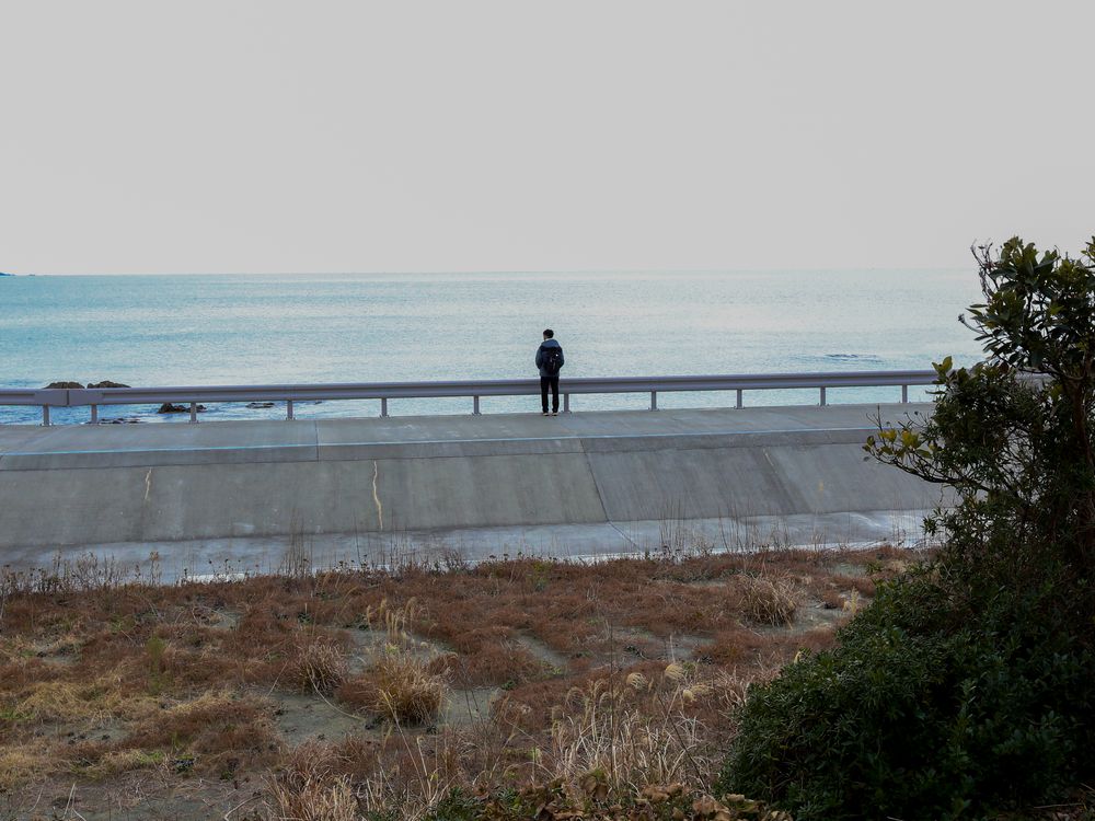 A lone traveler stands upon a concrete seawall in Japan, gazing out at the vast, calm ocean. The minimalist composition emphasizes the scale of nature versus humanity, capturing a quiet moment of introspection during a journey.