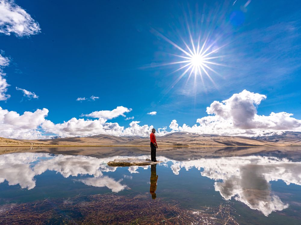 A guy stands on small rock in lake with great himalays behind him in Tsomirir Lake Ladakh. The peace he felt can be seen in this image with great mountains and sun star behind him