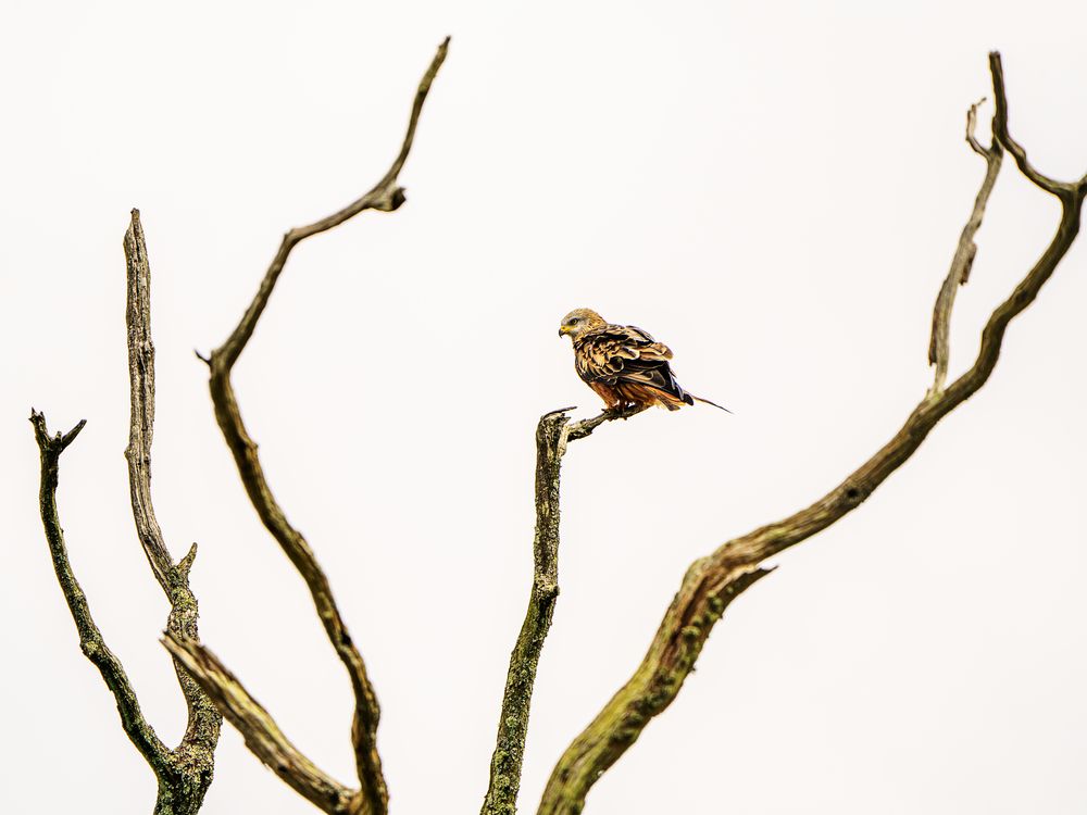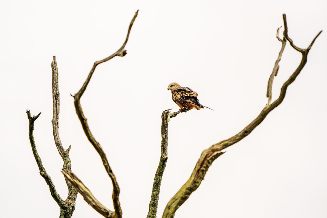 A lone hawk perches on a web of bare branches, suspended against an almost pure white sky. The simplicity of the composition amplifies its quiet power — no distractions, no clutter, just the stark geometry of nature and the poised stillness of the bird. Every line and curve contributes to a sense of solitude and balance, evoking both fragility and strength. The photograph captures a moment of silent vigilance, where time seems to hold its breath, and the hawk becomes both observer and symbol of clarity amid emptiness.