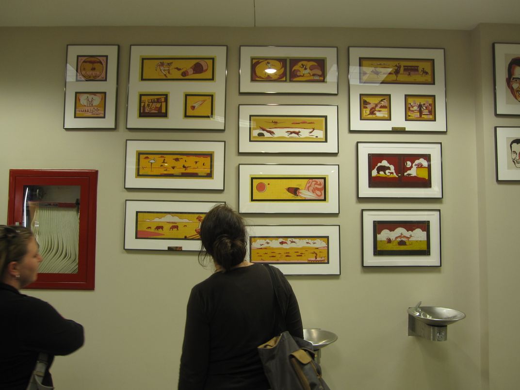 Some friends taking a look at drawings of old corn designs at the Corn Palace in South Dakota.