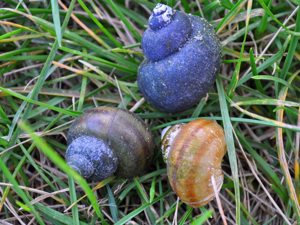 Some shells, just sitting on the grass by a beach, looking pretty as a picture.