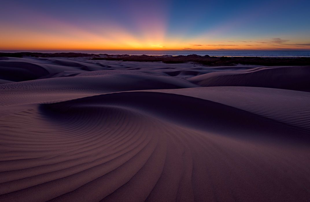 The Pismo Dunes on the Coast of California are a unique place where you have incredible and largely untracked dunes that fade into the sea. I really liked the foreground wave shape of the dune but when the sun started putting out sunbeams and golden and blue hour blended together I was very happy.
