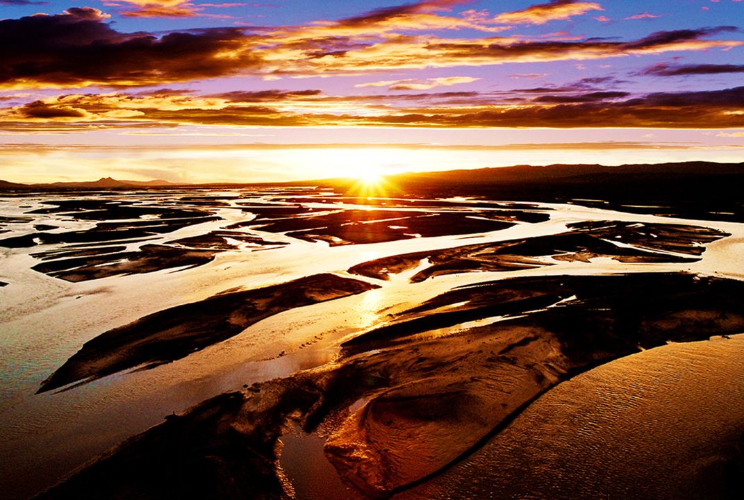 The setting sun turns clouds molten gold, scattering light across winding waterways. The folds of the mudflats glow warm yellow, and even the wind slows into amber flow. The land and sky are immersed in softness, where shadows tremble with gentle warmth.