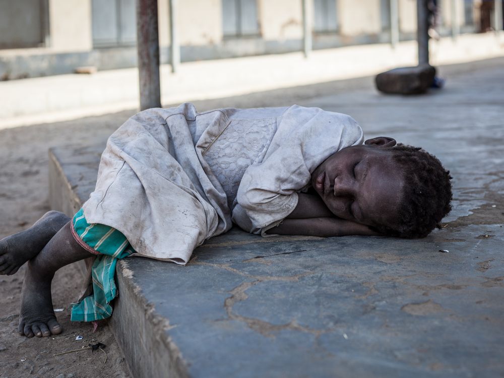 A young South Sudanese girl sleeps on the floor after reaching Afoji collection point in Afoji town in northern Uganda. The local market in Afoji town has been transformed into a collection point where refugees can access basic facilities including shelter, water, latrines, medical attention and transportation to the refugee settlements.
