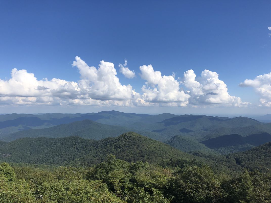 This photo shows an eastern view of the Southern Appalachian Mountains while atop the observation deck at Brasstown Bald, the highest mountain in Georgia (4,784 ft above sea level). A clear day with the formation of Cumulus Clouds over the landscape is a spectacular sight.