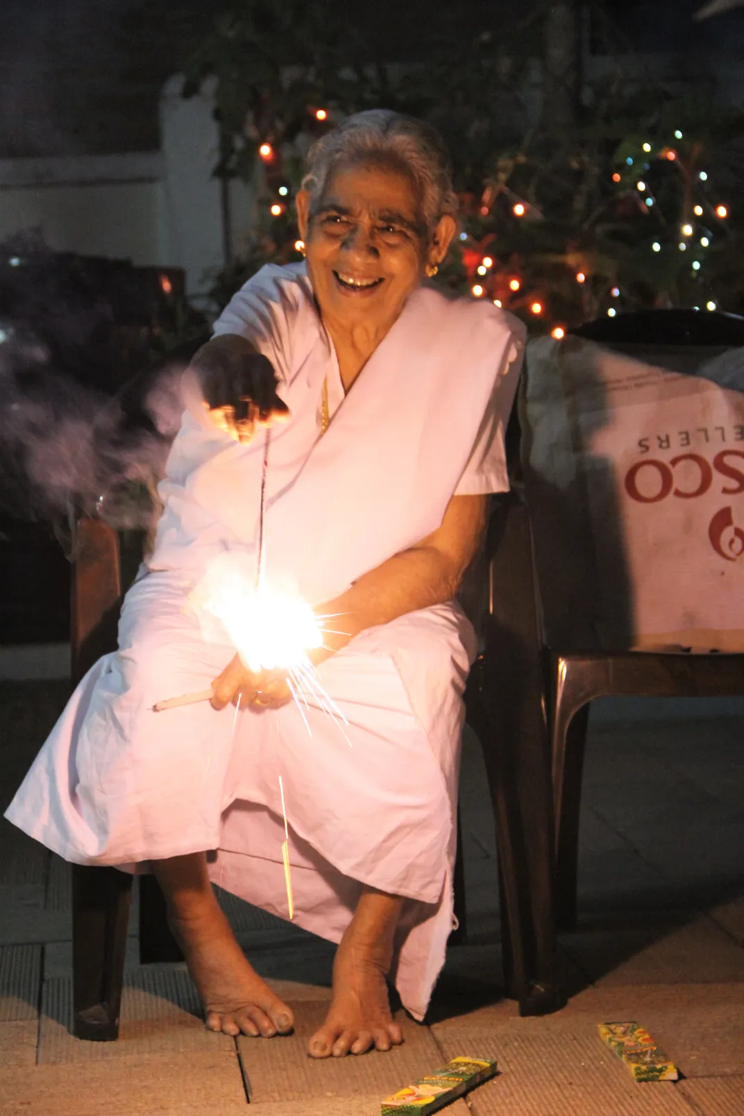 The glow of the sparkler she held was outdone by the sparkling smile of this great grandmother. The rare sparkle in her eye belied her steady decent into dememtia. Her pristine white cotton 'chatta-mundu' is a piece of traditional sartorial elegance that is rapidly disappearing into oblivion along with the older generation of Syrian Christians in Kerala.