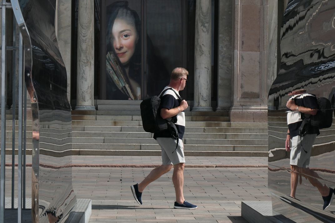 Spiegelbild zeigt einen Mann der an einem Spiegel vorbei geht. Im Hintergrund ist eine Frau auf einem Plakat die ihn ansieht.