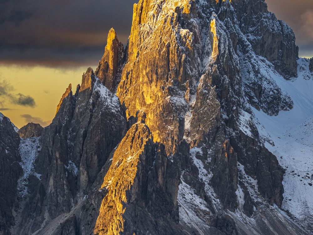The first rays of sunrise illuminate one of the peaks of Cadini di Misurina