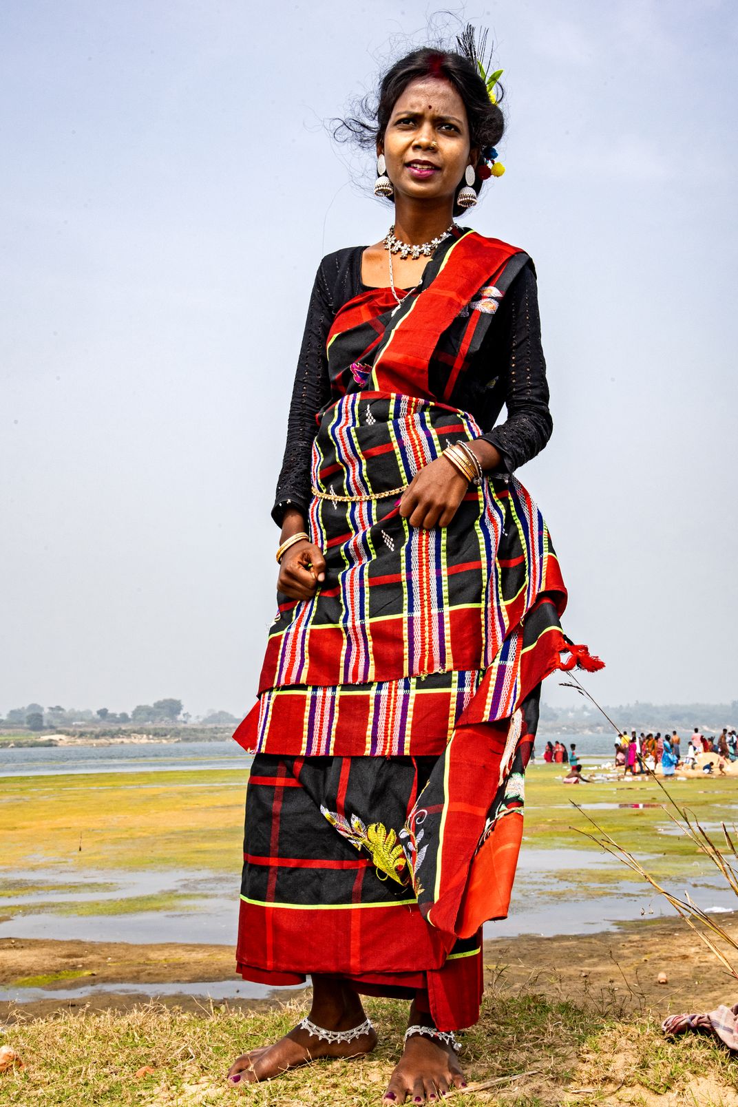 A tribal girl stands proudly in vibrant traditional attire, her jewellery and colours reflecting the soul of the festival. Captured against the open landscape, she embodies cultural grace, strength, and timeless heritage.