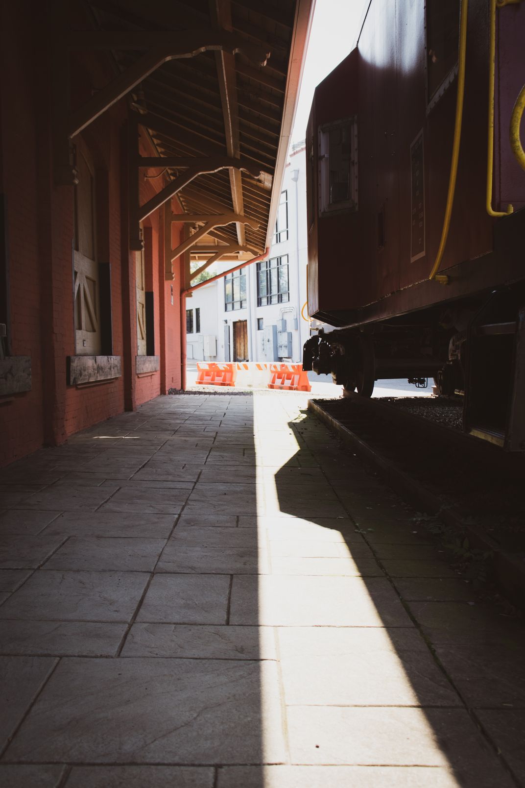 A hard shadow contrast separating a train station from the train, yet no one around to decide where to go.