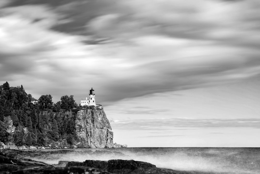 A black and white, long exposure image of a Split Rock Lighthouse towering over Lake Superior in northern Minnesota.