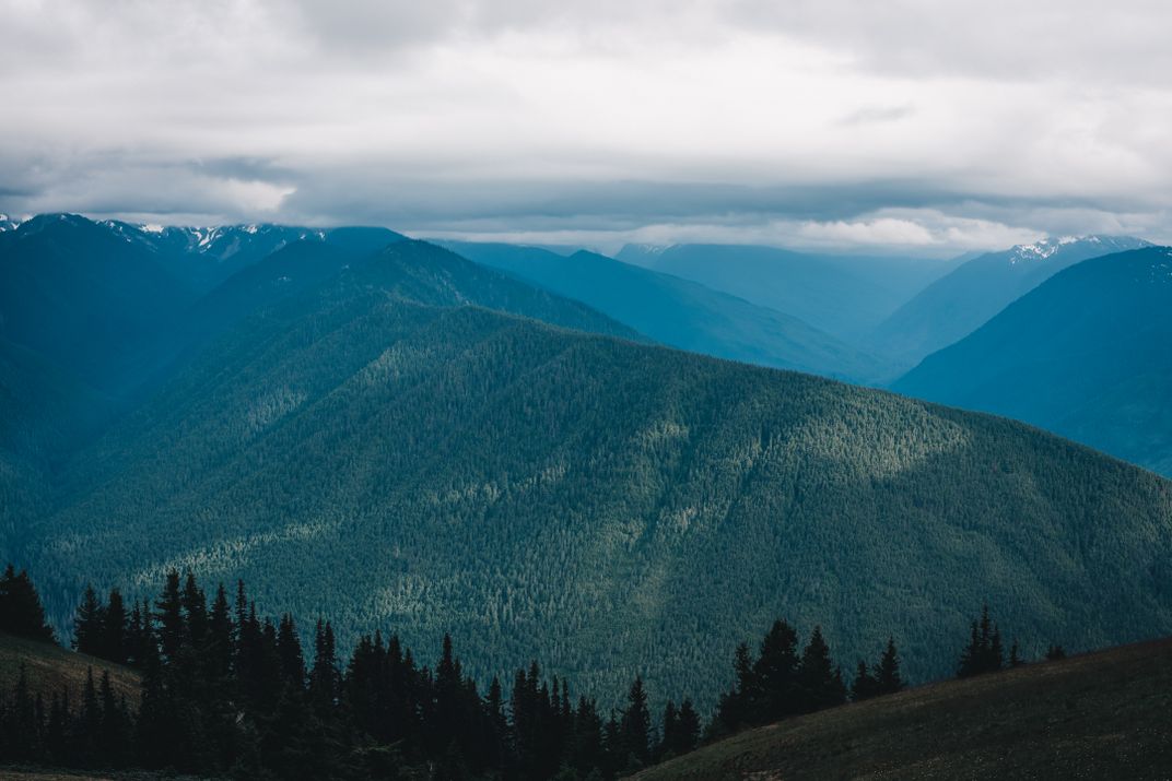 A fleeting patch of sunlight hits the mid-ground ridge on Independence Day 2025. The contrast between the illuminated forest and the deep blue, misty peaks creates a dramatic sense of depth.