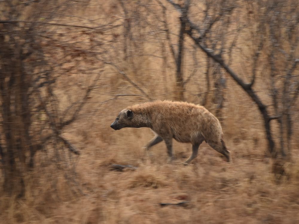 A solo hyena keeping a steady pace in the misty morning at Kruger National Park.