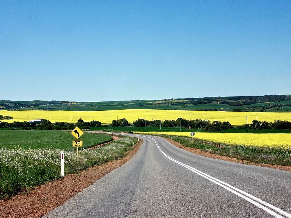 This photo shows beautiful canola flowers during spring. Behind these yellow flowers are green wheat plants. This together with road gives this picture great colour combinations.