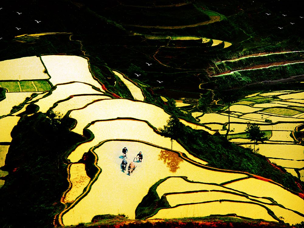 The water surface and the old farmers in the fields, form a living scene of spring plough.