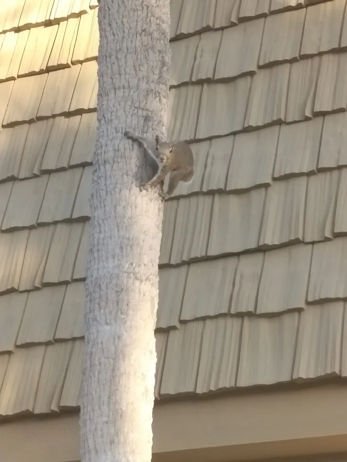 A squirrel is clinging to a tree in the parking lot of the apartment complex I live in. I saw him there as I was commencing my daily constitutional one morning.